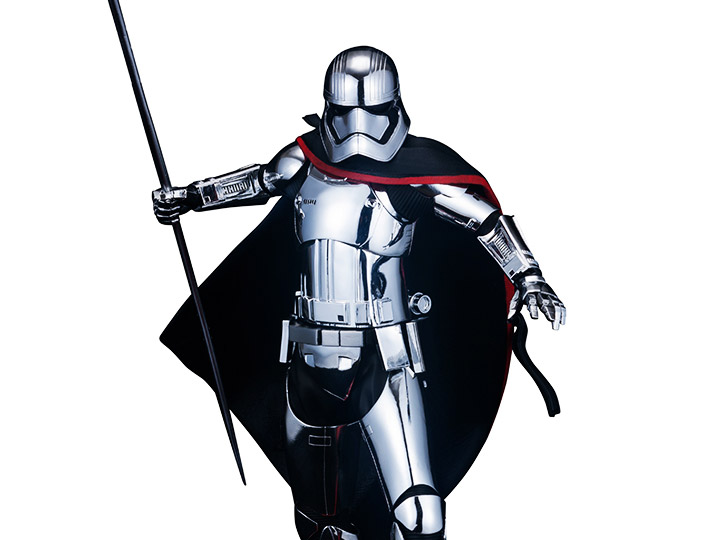 Captain Phasma advances menacingly, ready to crush anyone in the way of the First Order! She stands in a powerful pose, stepping forward with her head down, one hand leading the way in front of her, and the other stretched out behind her holding a wicked spear. The Captain wears her iconic Chromium Stormtrooper armor, replicated here with special metal plating polished to a mirror sheen. Her armor is intricately detailed and features a belt with utility items, panels and decorations, and even a matching silver blaster attached to her right thigh; meanwhile, a long black cape edged in red billows out behind her making her look even more intimidating!