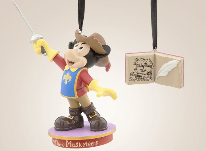 The set includes two Sketchbook Ornaments, Musketeer Mickey Mouse as seen in Disney’s home video production, The Three Musketeers (2004), plus a miniature book ornament with quill pen.